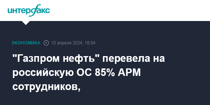 Москва. 10 апреля. INTERFAX.RU - "Газпром нефть" перевела 85% пользовательских устройств (АРМ) на российскую операционную систему Astra Linux (разработчик - "Группа Астра"), сообщил "Интерфаксу" начальник департамента информационных технологий, автоматизации и телекоммуникаций "Газпром нефти" Антон Думин.