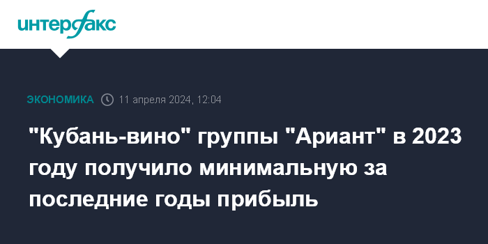 Москва. 11 апреля. INTERFAX.RU - Компания "Кубань-вино", объединяющая винодельческие площадки группы "Ариант" в Краснодарском крае, завершила 2023 год с чистой прибылью по РСБУ в размере 13,2 млн рублей, сообщается в отчете компании.