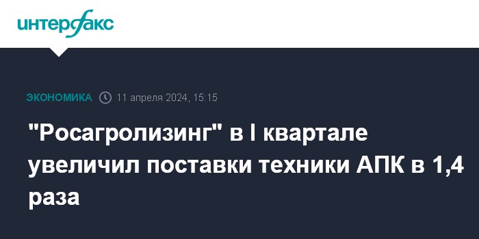 Москва. 11 апреля. INTERFAX.RU - "Росагролизинг" в первом квартале этого года поставил аграриям 4,2 тыс. единиц сельхозтехники, что на 44,3% больше, чем за аналогичный период прошлого года, сообщается в пресс-релизе компании.