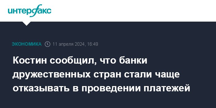 Москва. 11 апреля. INTERFAX.RU - Банки "дружественных" стран с конца 2023 года стали чаще отказывать российским компаниям в проведении платежей, сообщил глава ВТБ Андрей Костин.