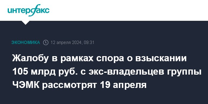 Жалобу в рамках спора о взыскании 105 млрд руб. с экс-владельцев группы ЧЭМК рассмотрят 19 апреля