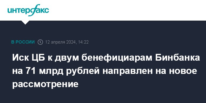 Иск ЦБ к двум бенефициарам Бинбанка на 71 млрд рублей направлен на новое рассмотрение