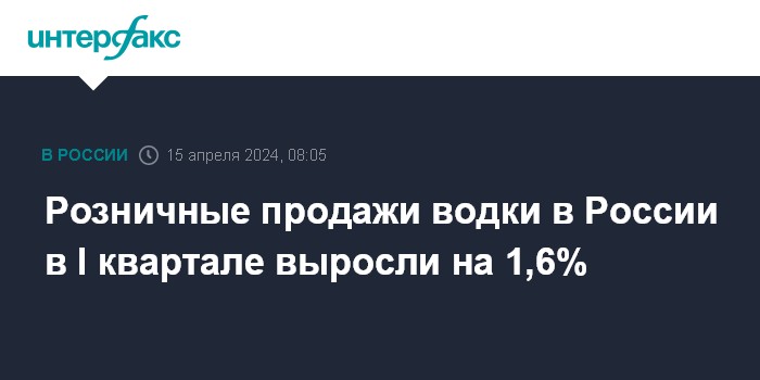 Москва. 15 апреля. INTERFAX.RU - В России в I квартале 2024 года розничные продажи водки составили 18,4 млн декалитров (дал), что на 1,6% больше, чем в январе-марте 2023 года, сообщает Росалкогольтабакконтроль.