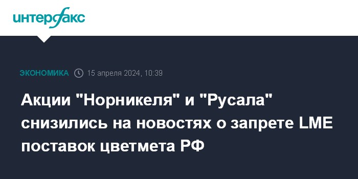 Москва. 15 апреля. INTERFAX.RU - Акции "Норникеля", "Русала" и "Русолово" снизились в начале торгов на Московской бирже в понедельник на 1,9-3% на новостях о запрете LME поставок российских цветных металлов после введенных США и Великобританией санкций; при этом основные российские фондовые индексы демонстрируют в целом боковую динамику.