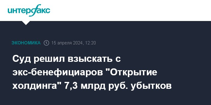 Москва. 15 апреля. INTERFAX.RU - Арбитражный суд Москвы в конце марта решил солидарно взыскать с троих бывших бенефициаров "Открытие холдинга" и одной компании в пользу холдинга 7,3 млрд рублей убытков.