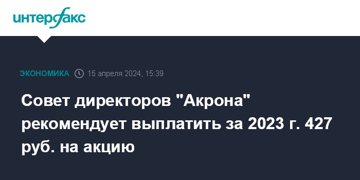 Совет директоров "Акрона" рекомендует выплатить за 2023 г. 427 руб. на акцию