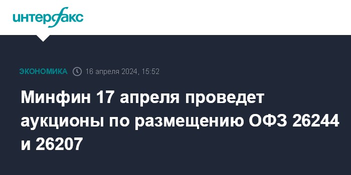 Минфин 17 апреля проведет аукционы по размещению ОФЗ 26244 и 26207