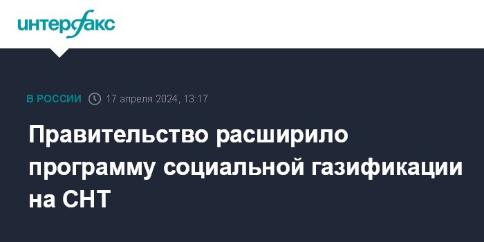 Москва. 17 апреля. INTERFAX.RU - Правительство расширило программу социальной газификации на садоводческие товарищества, сообщает сайт правительства и напоминает, что это сделано по поручению президента. Соответствующее постановление подписал премьер-министр Михаил Мишустин.