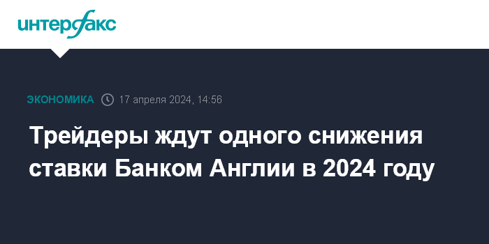 Москва. 17 апреля. INTERFAX.RU - Трейдеры после публикации свежих данных об инфляции в Великобритании пересмотрели прогнозы и теперь ждут всего одного понижения базовой процентной ставки Банком Англии в этом году, сообщает Bloomberg.