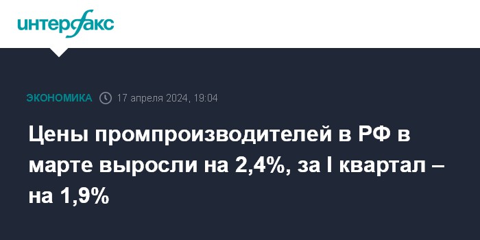 Москва. 17 апреля. INTERFAX.RU - Цены производителей промышленных товаров в РФ в марте 2024 года выросли на 2,4% после роста на 0,9% в феврале, снижения на 1,4% в январе, падения на 3,1% в декабре, сокращения на 0,1% в ноябре и роста на 2% в октябре, сообщил в среду Росстат.