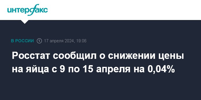 Москва. 17 апреля. INTERFAX.RU - В России цены на яйца с 9 по 15 апреля снизились на 0,04%, сообщил Росстат.