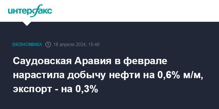 Москва. 18 апреля. INTERFAX.RU - Саудовская Аравия в феврале увеличила добычу нефти на 0,6% к январю, экспорт - на 0,3%, сообщает сайт Joint Organization Data Initiative (JODI).