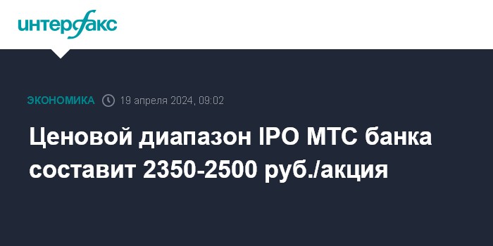 Москва. 19 апреля. INTERFAX.RU - Диапазон цены размещения в рамках первичного публичного предложения (IPO) МТС банка составит 2350-2500 руб. за акцию, говорится в материалах кредитной организации.