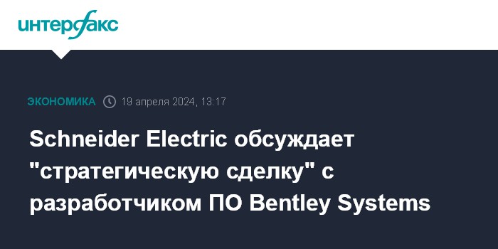 Москва. 19 апреля. INTERFAX.RU - Французская Schneider Electric ведет переговоры о возможной сделке с американским разработчиком программного обеспечения для проектирования инфраструктуры Bentley Systems, рыночная стоимость которого составляет $15,5 млрд.