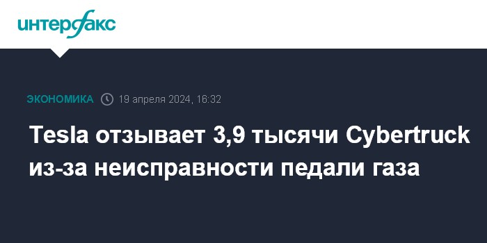 Москва. 19 апреля. INTERFAX.RU - Американская Tesla отзывает около 3,9 тысячи электропикапов Cybertruck в связи с неисправностью педали газа, сказано на сайте Национального управления по безопасности дорожного движения США (National Highway Transportation Safety Administration, NHTSA).