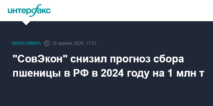 Москва. 19 апреля. INTERFAX.RU - Аналитический центр "СовЭкон" снизил прогноз урожая пшеницы в РФ в 2024 году на 1 млн тонн до 93 млн тонн.