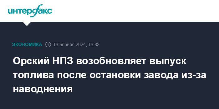 В Минэнерго РФ отмечали, что остановка Орского НПЗ не повлияет на обеспечение внутреннего рынка моторными топливами, поскольку в РФ имеются достаточные запасы для полного удовлетворения спроса в пострадавшем от паводка регионе