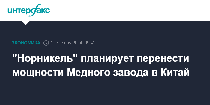 "Норникель" планирует перенести мощности Медного завода в Китай