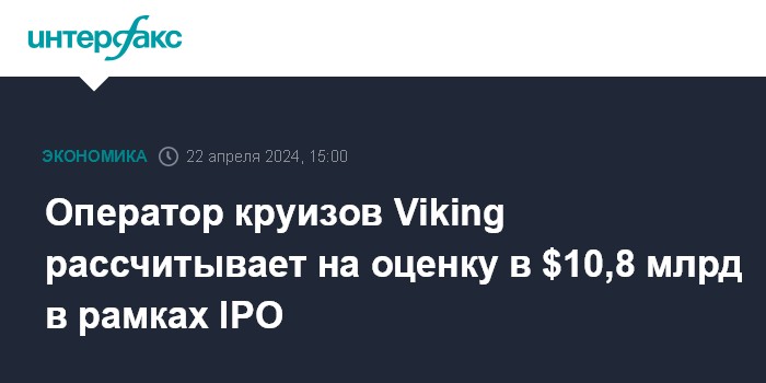Москва. 22 апреля. INTERFAX.RU - Оператор круизных лайнеров Viking Holdings Ltd. сообщил, что рассчитывает получить оценку стоимости в $10,8 млрд в рамках первичного размещения акций на Нью-Йоркской фондовой бирже (NYSE).