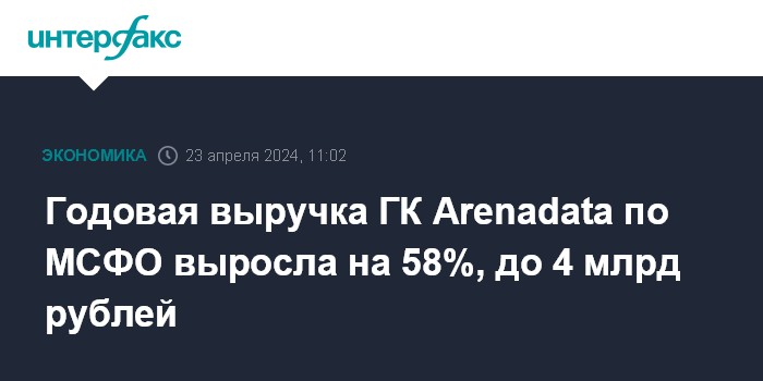 Москва. 23 апреля. INTERFAX.RU - Консолидированная выручка группы компаний Arenadata (занимается разработкой ПО в области хранения и анализа данных, основная операционная компания группы - "Аренадата Софтвер") по МСФО выросла в 2023 году на 58%, до 4 млрд рублей, сообщила группа.