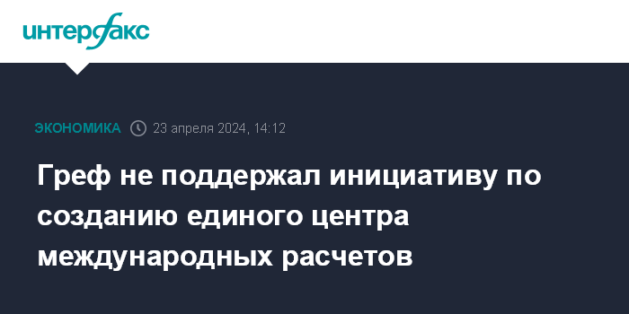 Москва. 23 апреля. INTERFAX.RU - Президент - председатель правления Сбербанка Герман Греф не поддержал идею создания единого центра международных расчетов при поддержке государства и Банка России.