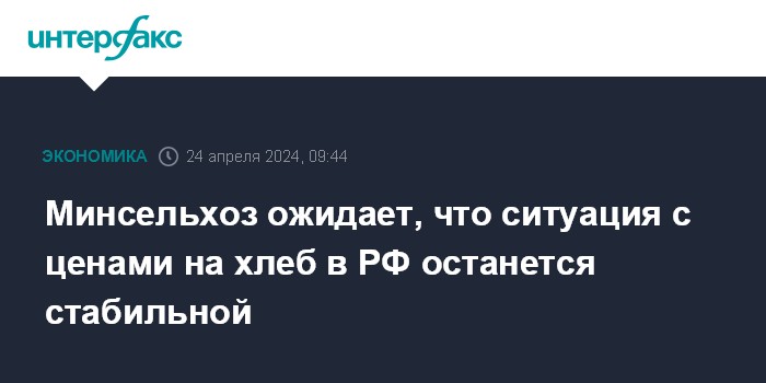 Москва. 24 апреля. INTERFAX.RU - Минсельхоз РФ ожидает сохранения стабильной ситуации на рынке хлеба.