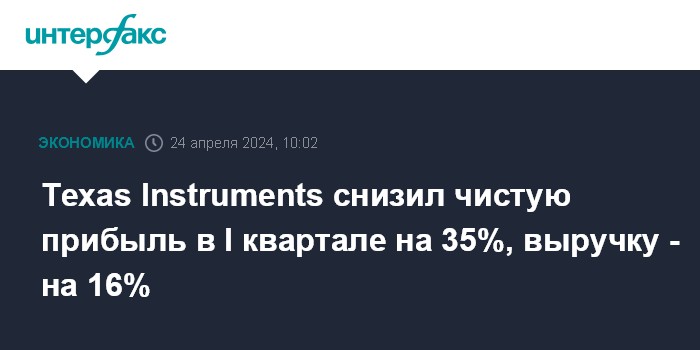Москва. 24 апреля. INTERFAX.RU - Американская Texas Instruments Inc., разработчик и производитель полупроводниковых компонентов, сократила чистую прибыль в первом квартале 2024 года на 35%, выручку - на 16%.
