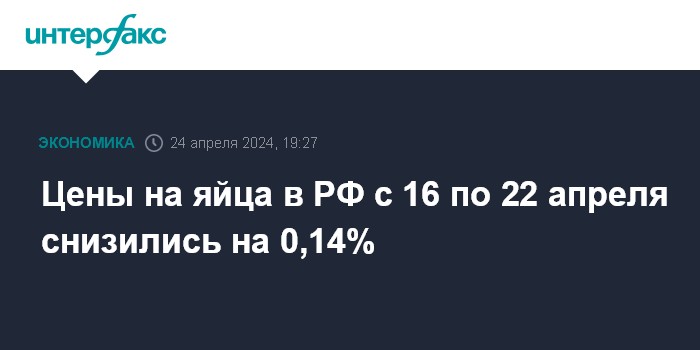Москва. 24 апреля. INTERFAX.RU - Цены на яйца в РФ с 16 по 22 апреля снизились на 0,14%, сообщил Росстат в среду.