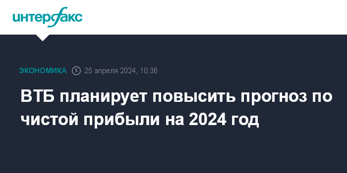 Москва. 25 апреля. INTERFAX.RU - ВТБ после публикации отчетности за второй квартал планирует повысить прогноз по чистой прибыли на 2024 год, заявил журналистам первый зампред кредитной организации Дмитрий Пьянов.