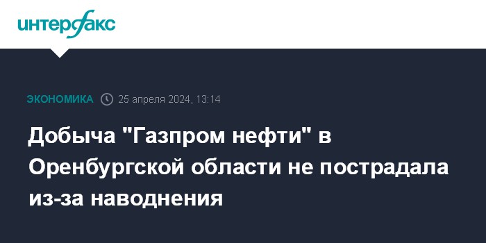 Москва. 25 апреля. INTERFAX.RU - Добыча "Газпром нефти" в Оренбургской области не пострадала из-за наводнения, сообщил журналистам глава НК Александр Дюкова.
