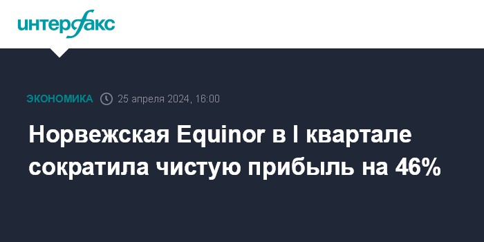 Москва. 25 апреля. INTERFAX.RU - Норвежская нефтегазовая компания Equinor ASA в первом квартале 2024 года сократила чистую прибыль на 46%, в том числе из-за снижения цен на природный газ.