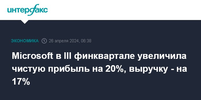 Москва. 26 апреля. INTERFAX.RU - Американская Microsoft Corp. в третьем квартале 2024 финансового года увеличила чистую прибыль на 20%, выручку - на 17%, при этом оба показателя оказались лучше ожиданий аналитиков.