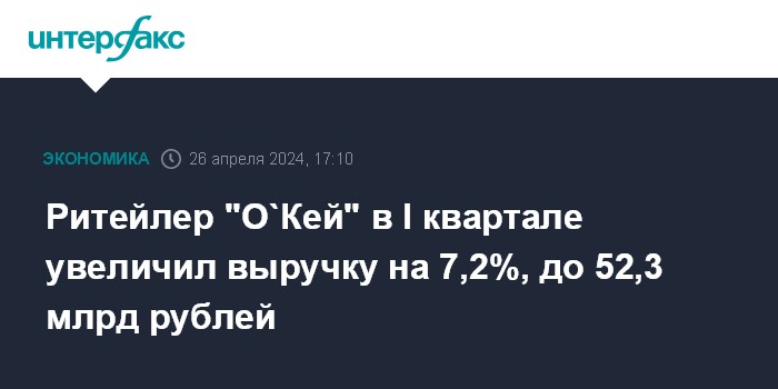 Москва. 26 апреля. INTERFAX.RU - Ритейлер "О`Кей" (O`Key Group) в I квартале 2024 года увеличил чистую розничную выручку на 7,2% по сравнению с показателем за I квартал 2023 года, до 52,3 млрд рублей, говорится в сообщении компании.