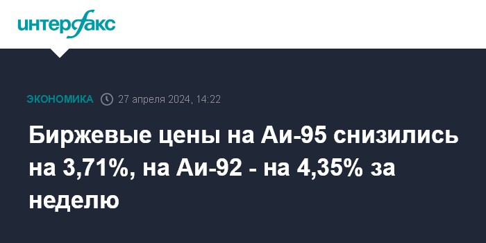 Биржевые цены на Аи-95 снизились на 3,71%, на Аи-92 - на 4,35% за неделю