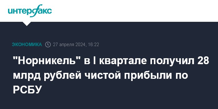 Москва. 27 апреля. INTERFAX.RU - Чистая прибыль ГМК "Норильский никель" по РСБУ в I квартале 2024 года составила 28,24 млрд рублей по сравнению с чистым убытком в 31,66 млрд рублей годом ранее, сообщила компания.