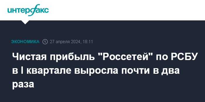 Москва. 27 апреля. INTERFAX.RU - Чистая прибыль ПАО "Россети" по РСБУ в I квартале 2024 года выросла почти в два раза по сравнению с аналогичным периодом прошлого года, до 134,7 млрд руб., говорится в отчете компании.