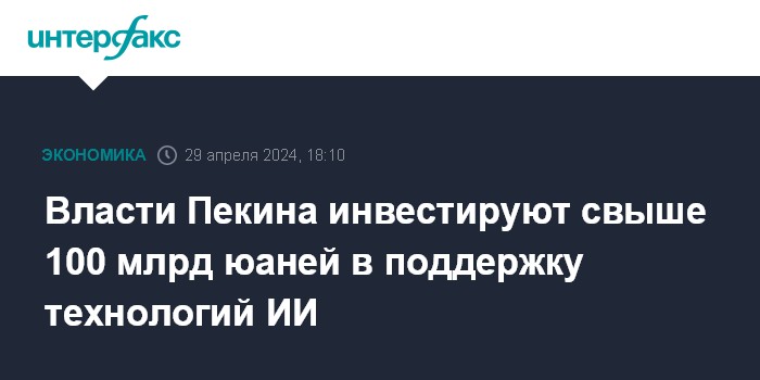 Москва. 29 апреля. INTERFAX.RU - Власти Пекина планирует инвестировать более 100 миллиардов юаней ($13,8 млрд) в поддержку технологий искусственного интеллекта (ИИ) в течение следующих пяти лет, пишет China Securities Journal.