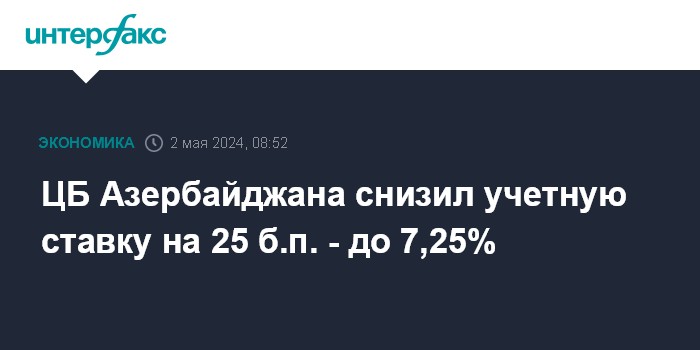 Москва. 2 мая. INTERFAX.RU - Центральный банк Азербайджана (ЦБА) снизил со 2 мая учетную ставку до 7,25% с 7,5%.