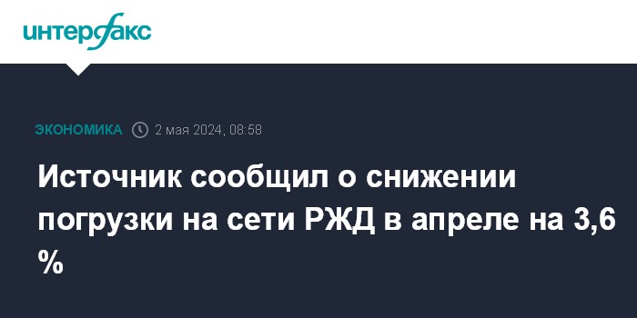 Москва. 2 мая. INTERFAX.RU - Среднесуточная погрузка на сети ОАО "Российские железные дороги" в апреле 2024 года снизилась на 3,6% в годовом исчислении, до 3390,8 тысячи тонн, сообщил "Интерфаксу" источник, знакомый с деятельностью компании.