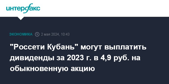 "Россети Кубань" могут выплатить дивиденды за 2023 г. в 4,9 руб. на обыкновенную акцию
