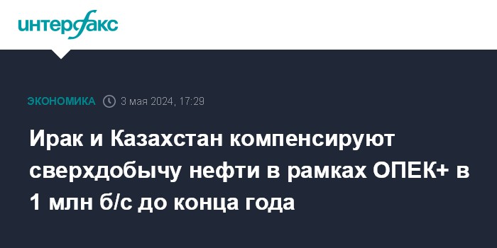 Москва. 3 мая. INTERFAX.RU - Ирак и Казахстан компенсируют до конца текущего года объемы нефти, добытые сверх установленных для стран квот ОПЕК+, говорится в сообщении ОПЕК.