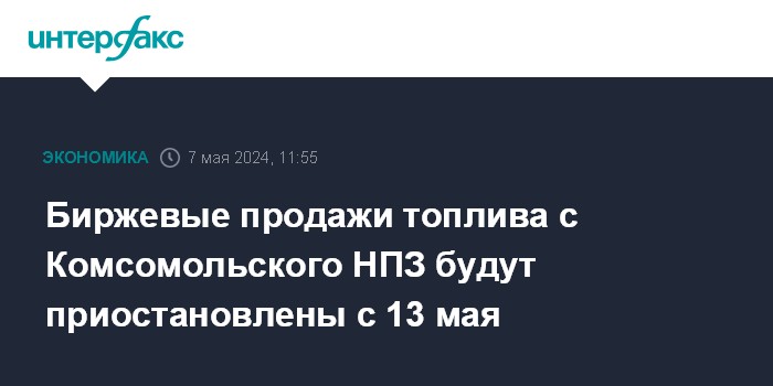 Биржевые продажи топлива с Комсомольского НПЗ будут приостановлены с 13 мая