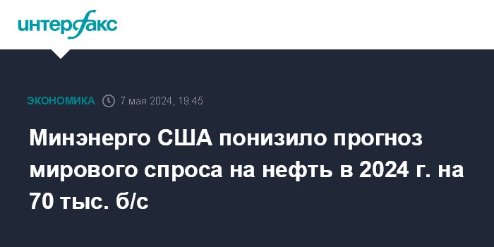 Минэнерго США понизило прогноз мирового спроса на нефть в 2024 г. на 70 тыс. б/с