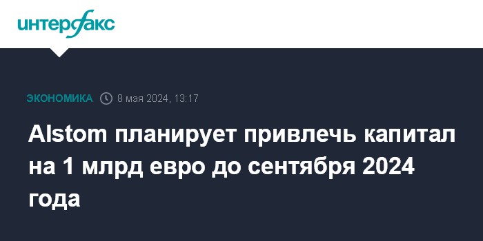 Москва. 8 мая. INTERFAX.RU - Французский машиностроительный концерн Alstom планирует привлечь капитал на сумму около 1 млрд евро в рамках общего плана сокращения долговой нагрузки. Как говорится в пресс-релизе Alstom, размещение акций состоится не позднее сентября 2024 года.
