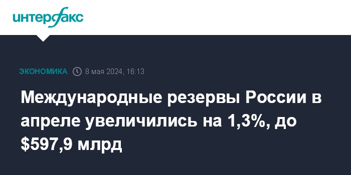 Москва. 8 мая. INTERFAX.RU - Объем международных (золотовалютных) резервов России в апреле 2024 года увеличился на $7,537 млрд, или на 1,3%, до $597,911 млрд с $590,374 млрд, следует из информации на сайте Банка России.