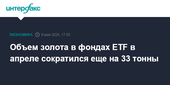 Москва. 8 мая. INTERFAX.RU - Мировые ETF (exchange traded funds - биржевые инвестиционные фонды) за апрель 2024 года потеряли еще $2,2 млрд, что соответствует 33,2 тонны золота, подсчитал World Gold Council (WGC).