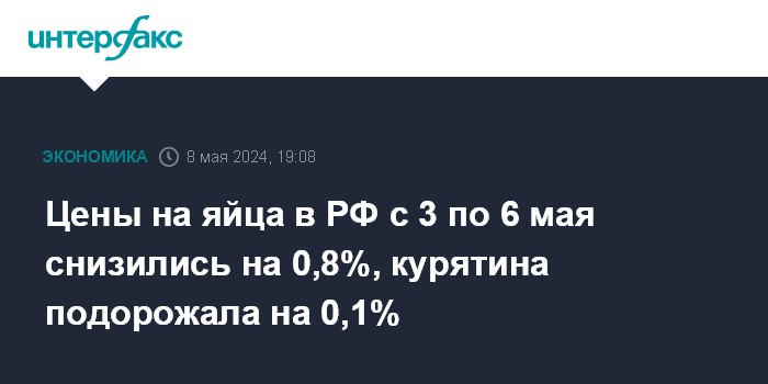 Цены на яйца в РФ с 3 по 6 мая снизились на 0,8%, курятина подорожала на 0,1%
