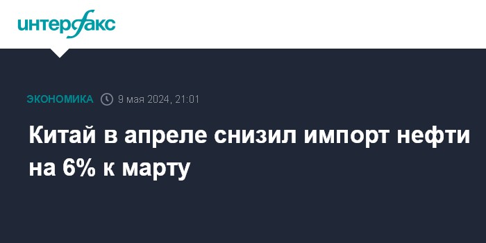 Москва. 9 мая. INTERFAX.RU - Среднесуточный объем импорта нефти Китаем в апреле снизился к марту на 6,2% - с 11,551 млн б/с до 10,882 млн б/с, свидетельствуют расчеты "Интерфакса" на основе данных Главного таможенного управления КНР.