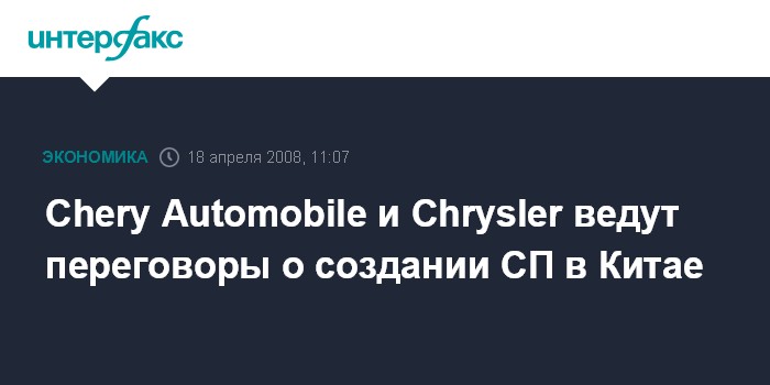 Шанхай. 18 апреля. INTERFAX.RU - Компания Chery Automobile, крупнейший в Китае производитель автомобилей, ведет переговоры с корпорацией Chrysler о возможном создании совместного предприятия в Китае, сообщила газета "Шанхай дейли" со ссылкой на пресс-секретаря Chery Цзинь Ибо.