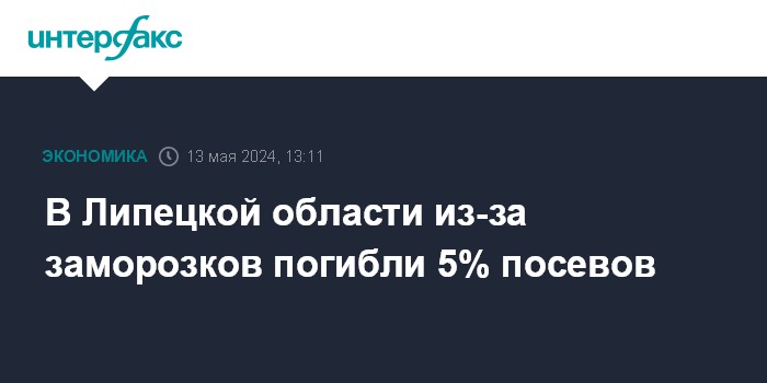 Москва. 13 мая. INTERFAX.RU - Заморозки в Липецкой области привели к гибели сельскохозяйственных культур на 5% от общей посевной площади, сообщил глава региона Игорь Артамонов.